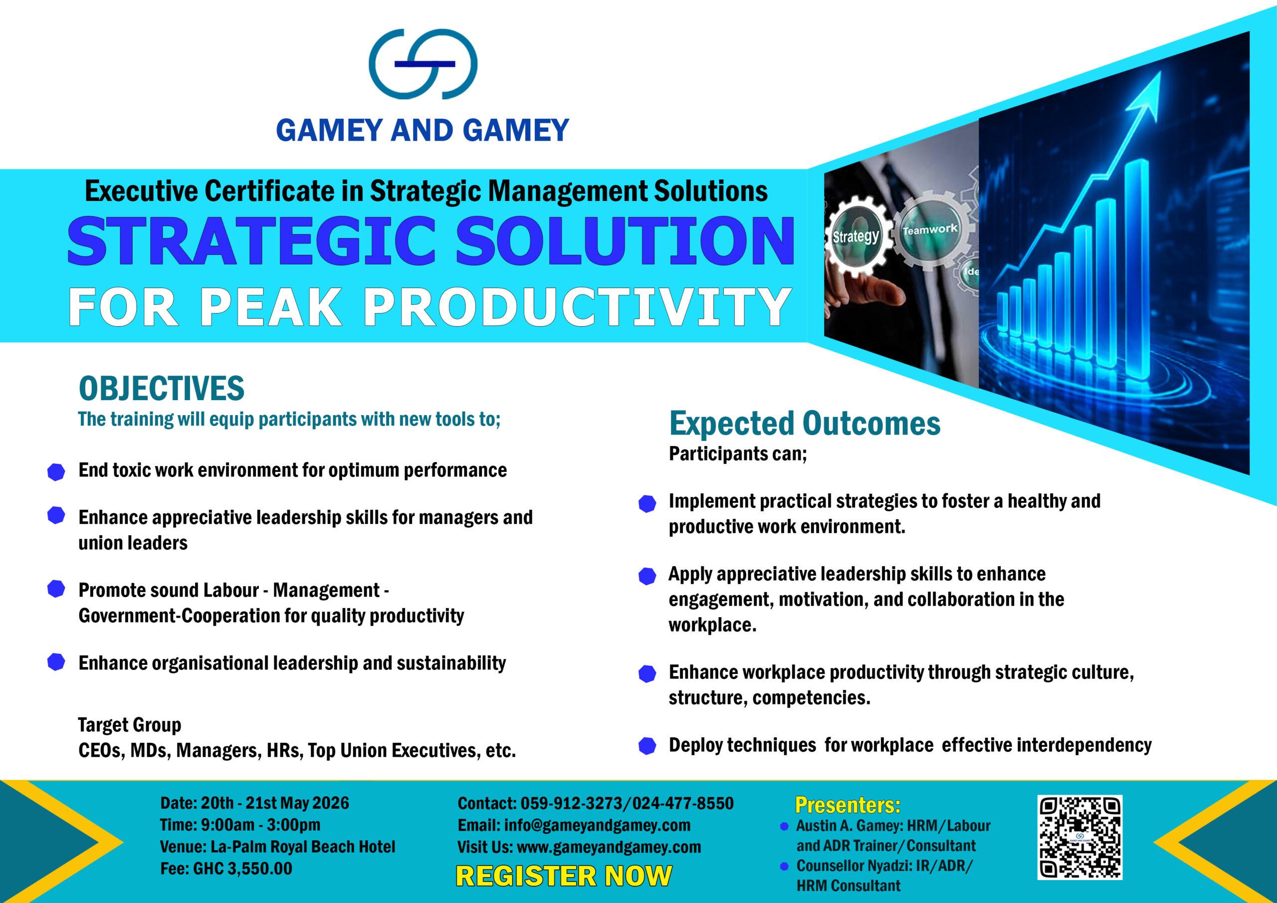 Gamey and Gamey Group is a proudly Ghanaian-registered company and a market leader in Ghana’s corporate landscape. With years of proven expertise, we specialize in providing top-tier Consultancy and Training services in Industrial Relations,Salary Administration and Productivity Management, Human Resource Management, Organizational Development, and Appropriate Dispute Resolution (ADR).